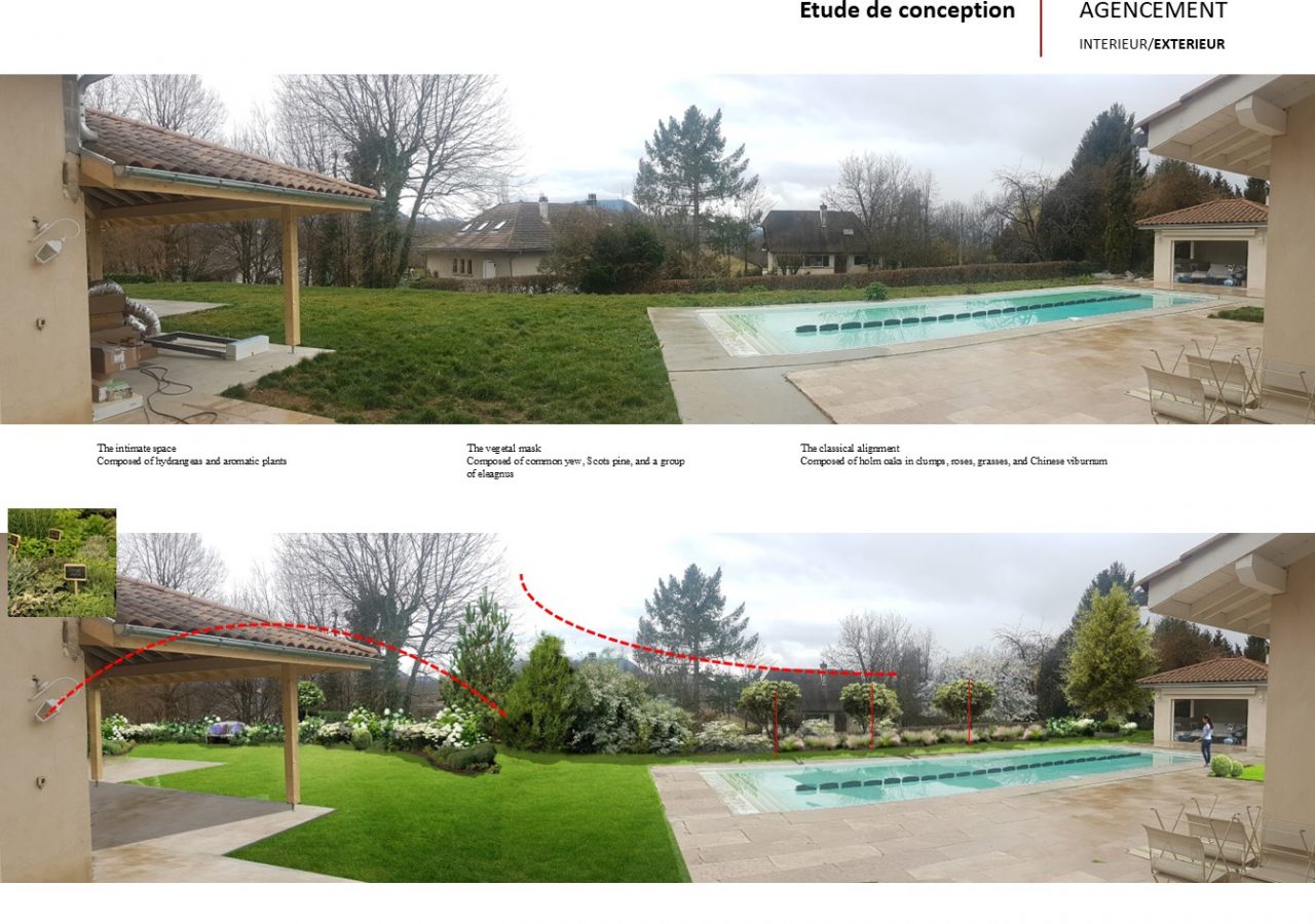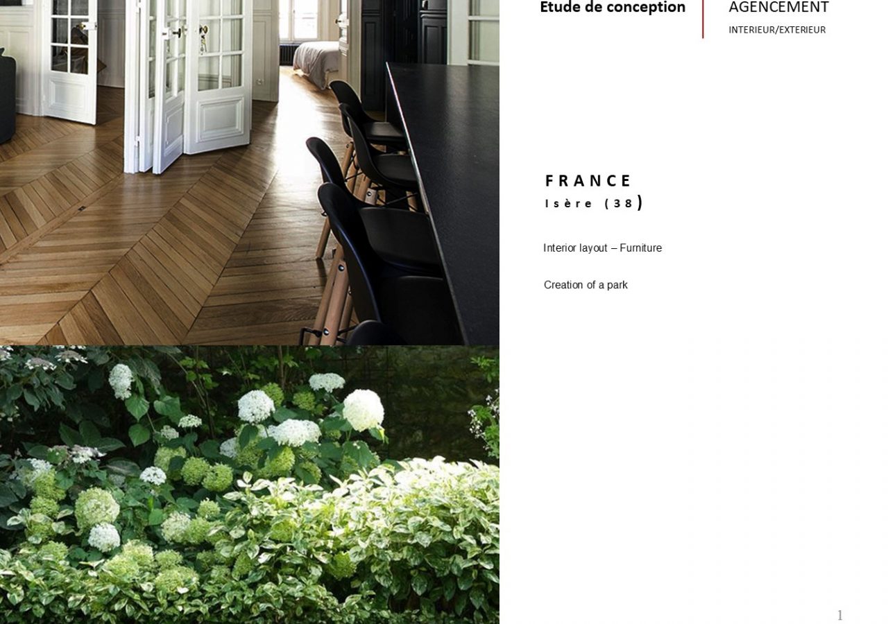 The project focuses on the interior renovation of an existing chalet, reorganizing spaces to modernize it while maintaining a timeless and elegant style. The study highlights: Interior redesign and furniture: harmonization of volumes, selection of furniture and color tones, work on materials and finishes (plaster, textures, etc.) to create a coherent and refined environment. Garden design: creation of a spacious garden allowing the generation of different vegetated areas, offering aesthetic contrasts while maintaining overall harmony. Conclusion: The study confirms the feasibility of a project combining modernity, elegance, and functionality, enhancing both interior and exterior spaces, and providing a comfortable and aesthetically pleasing living environment.