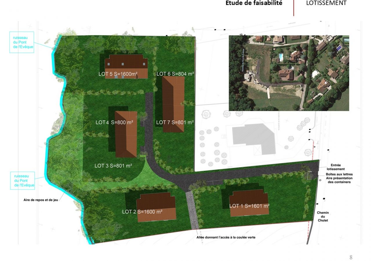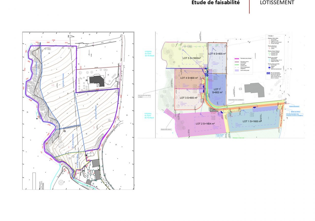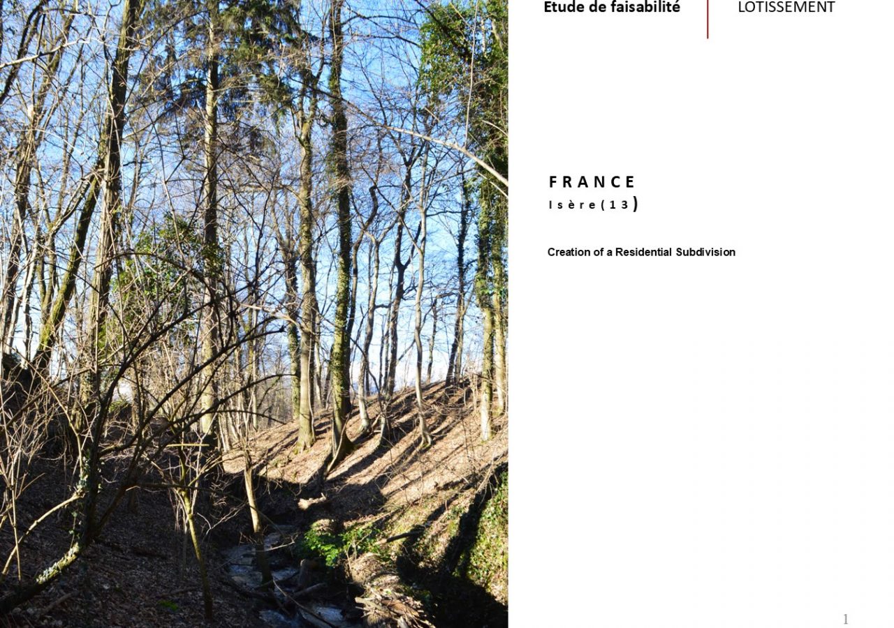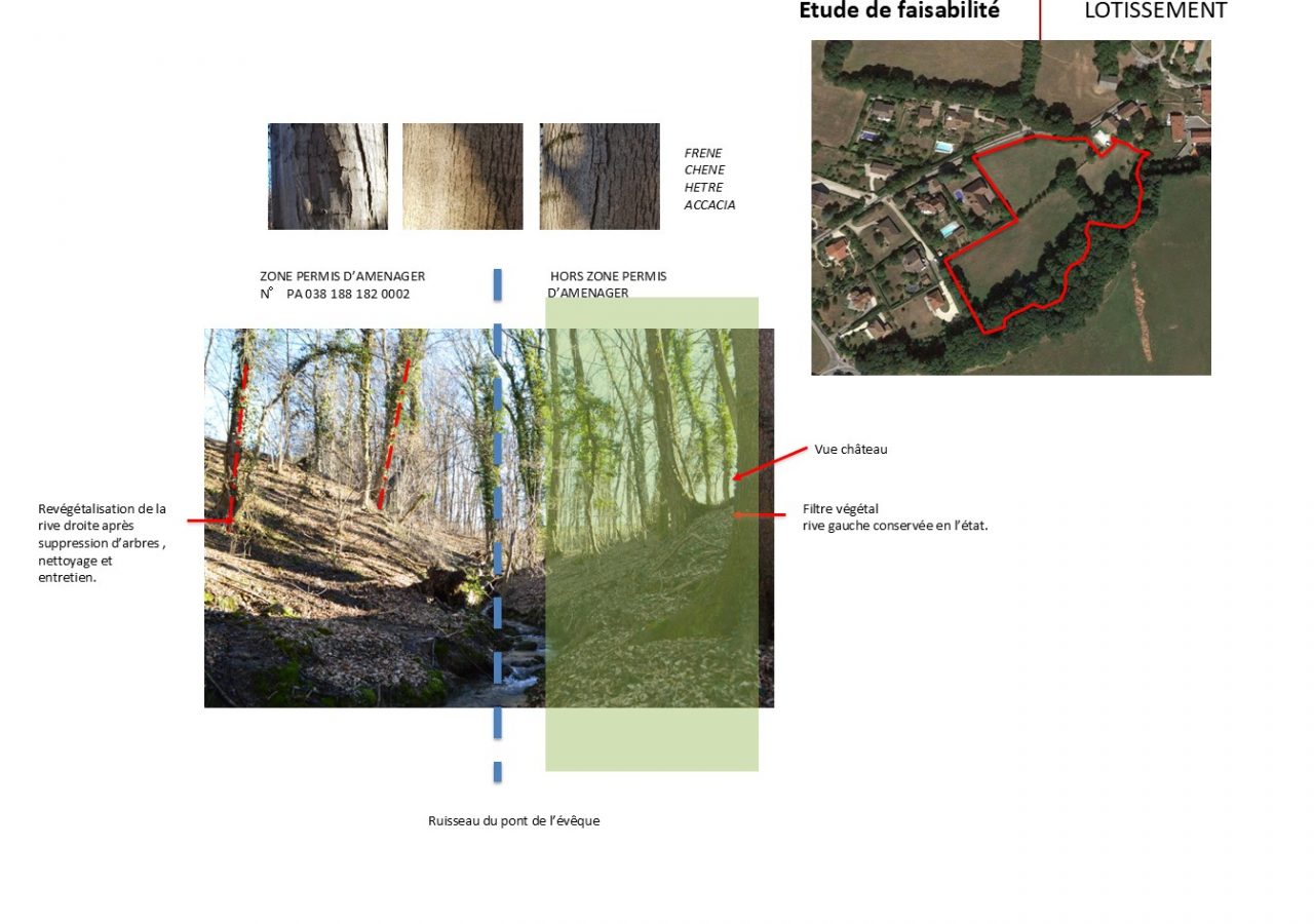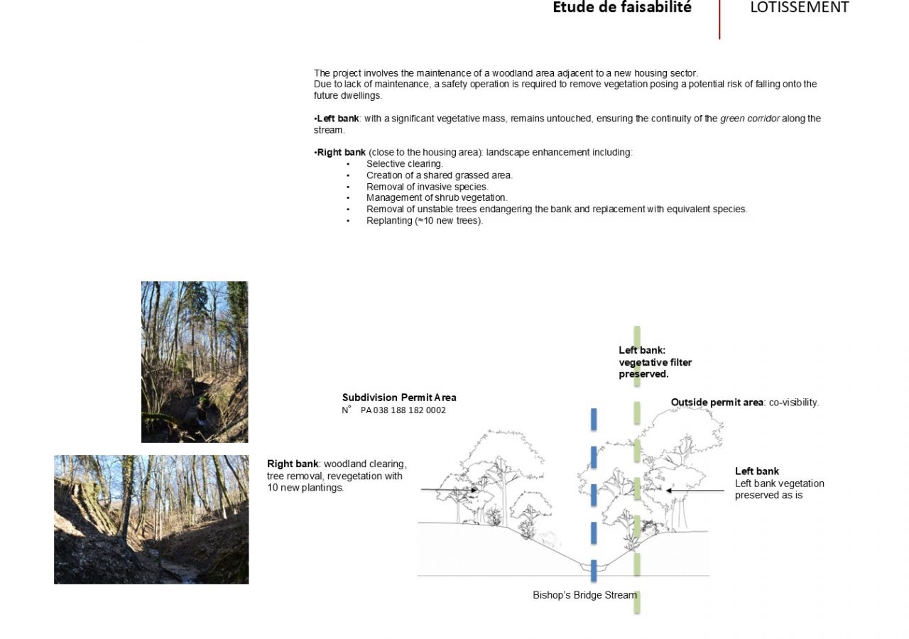D9 Feasibility Study Summary – Residential Subdivision Development (Isère) The project focuses on the creation of a residential subdivision on a remarkable site characterized by a stream, wooded areas, and a highly valuable natural landscape. Context: area identified by PA no. 038 188 182 0002, based on a topographic survey specifying property boundaries, natural features (trees, dry-stone walls, wells), and site constraints. Program: Development of buildable plots for new housing. Enhancement of the natural setting and differentiated management of the stream banks. Safety measures and maintenance of the nearby woodland to prevent risks. Landscape and environmental management: Left bank: preservation of the existing vegetative buffer and ecological continuity. Right bank: selective clearing, removal of invasive species and unstable trees, replanting of local species (≈10 new trees). Conclusion: The study confirms the feasibility of a sustainable residential subdivision, balancing urban development with biodiversity preservation. The project enhances the “green corridor” and offers an attractive living environment, in harmony with local environmental and heritage concerns.