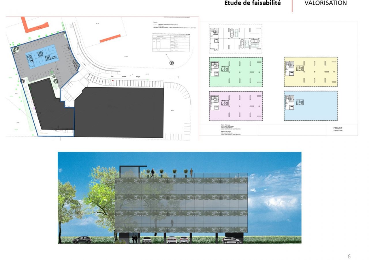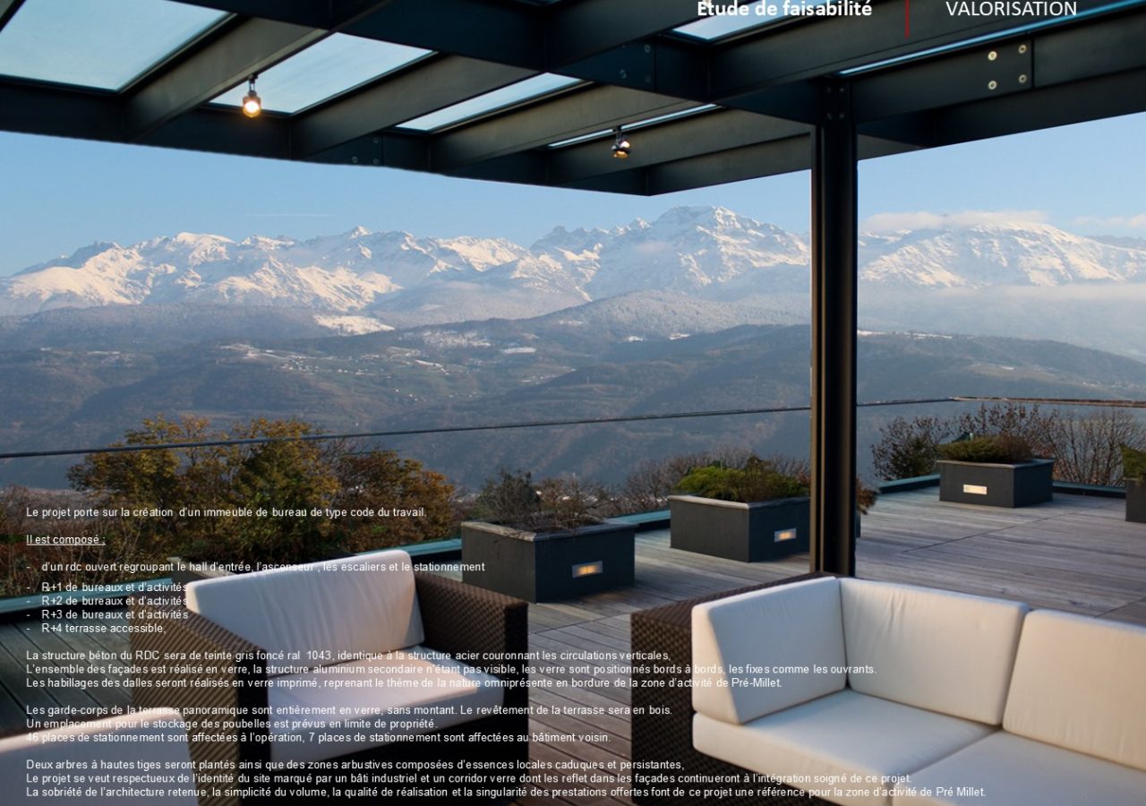 Le projet vise la construction d’un immeuble de bureaux sur une parcelle de la zone d’activité de Pré-Millet, actuellement occupée par un parking. • Programme : o RDC : hall d’accueil, ascenseur, escaliers, stationnement intégré. o R+1 à R+3 : plateaux de bureaux et espaces d’activités. o R+4 : terrasse panoramique avec garde-corps vitrés et revêtement bois. o 46 places de stationnement prévues + 7 places pour le bâtiment voisin ; local déchets en limite de propriété. • Architecture : o Structure béton gris foncé (RAL 1043) avec couronne en acier. o Façades vitrées continues, verres bord à bord pour homogénéité. o Habillages de dalles en verre imprimé, inspirés de thématiques naturelles. o Garde-corps vitrés sans montant, apportant transparence et légèreté. • Intégration paysagère : plantation de deux arbres de haute tige et zones arbustives locales, renforçant l’ancrage naturel du site. Conclusion : L’étude confirme la faisabilité d’un immeuble de bureaux contemporain, sobre et qualitatif, s’inscrivant dans la continuité architecturale du site. Ce projet concilie fonctionnalité, durabilité et élégance, et constitue une référence pour la zone de Pré-Millet.