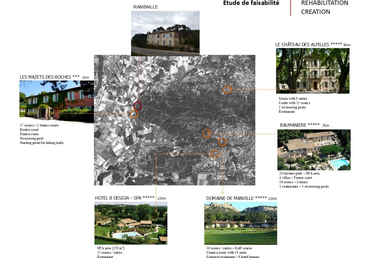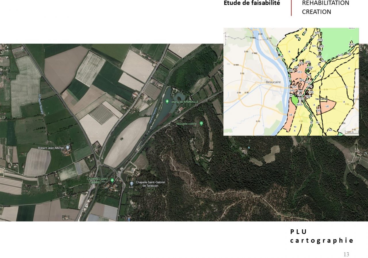 El proyecto tiene como objetivo la rehabilitación de un edificio histórico del siglo XVI en Tarascón, situado en un entorno excepcional a los pies de los Alpilles. El estudio destaca: El carácter patrimonial y geográfico notable del lugar. Un fuerte potencial de explotación gracias a la proximidad de hoteles prestigiosos, posicionando el proyecto dentro de una oferta de gama alta complementaria. Superficies aprovechables (planta baja, primera y segunda planta) que permiten diversos escenarios de uso: recepción, restauración, bienestar, alojamiento. Orientaciones programáticas que integran la valorización patrimonial, servicios de confort (SPA, piscina, restaurante) y actividades atractivas (culturales, eventuales, turísticas). La necesidad de respetar el marco regulatorio del PLU y las restricciones patrimoniales. El estudio confirma la viabilidad de transformar este edificio antiguo en un lugar de prestigio que concilie identidad histórica y estándares actuales de la hostelería de gama alta. Prevé la creación de un STECAL inscrito en el PLU, con validación pendiente por parte del ayuntamiento.